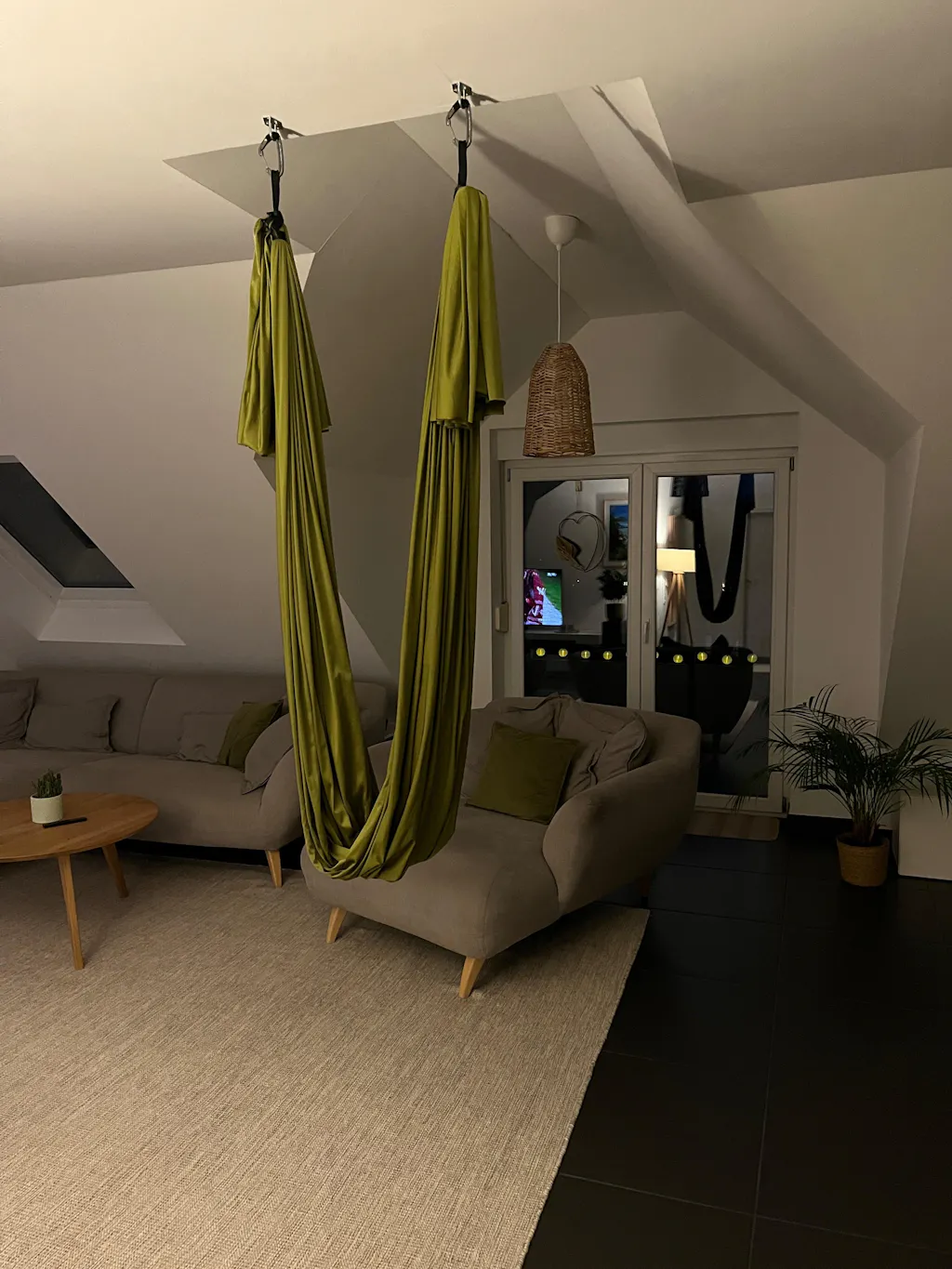 Dieses Mini-Set ist ideal, um das Tuch mit den Bindeschlingen zu binden und direkt an die Deckenhaken zuhängen. Perfekt geeignet, wenn deine Decken nicht höher als 2,70 m sind und du offene Deckenhaken installiert hast.